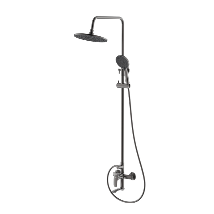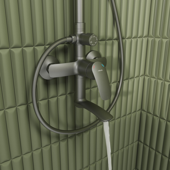 • Четырехрежимная ручная лейка (ø 120 мм) с держателем, ПВХ-шланг (1,5 м), штанга для душа с возможностью регулировки по высоте и крепеж идут в комплекте.
