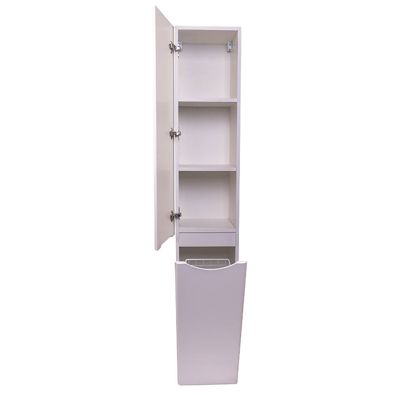 Пенал Style Line Бергамо 30 L Люкс Plus с б/к белый антискрейч отличается стильным современным внешним видом и продуманным функционалом. Внутри прямоугольного узкого шкафа установлены две полки для хранения, скрытые за распашной правосторонней дверцей, а также встроена откидная бельевая корзина. Пенал изготовлен из качественного влагостойкого МДФ с белым матовым покрытием и имеет универсальный монтаж – подвесной/напольный.