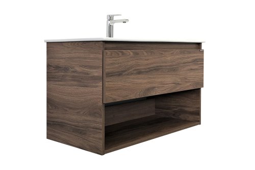 Подвесная тумба с ящиком оборудованным системой плавного закрывания и пространством для открытого хранения.