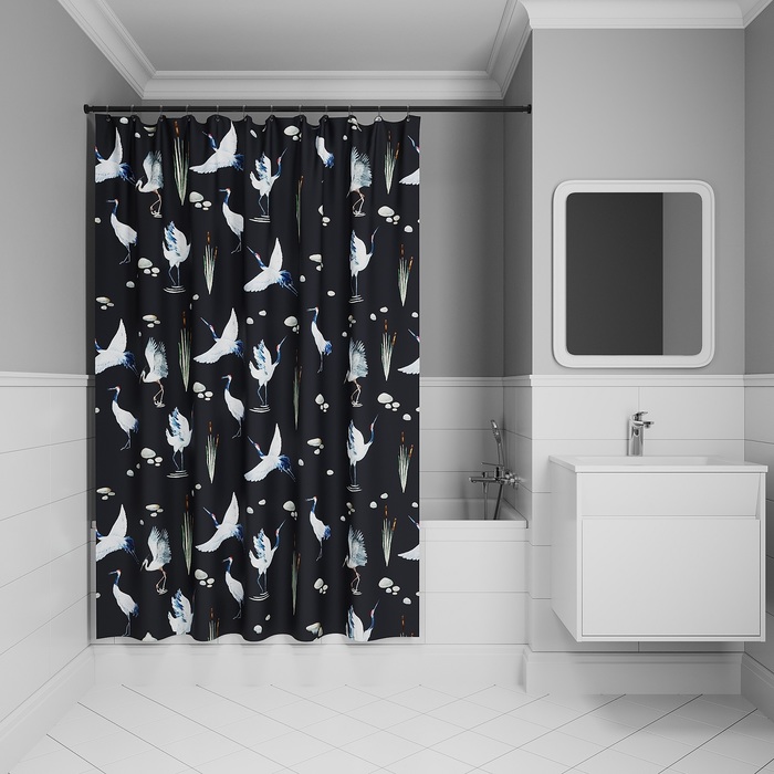 Текстильная штора для ванной черного цвета с белыми акварельными журавлями. Благодаря качественному рисунку штора выглядит элегантно и придаст изысканность любой ванной комнате.